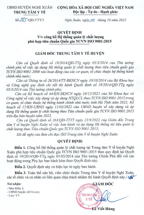 | Quyết định công bố Hệ thống quản lý chất lượng phù hợp tiêu chuẩn Quốc gia TCVN ISO 9001:2015