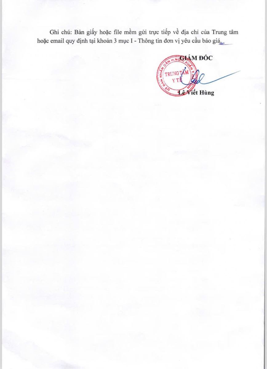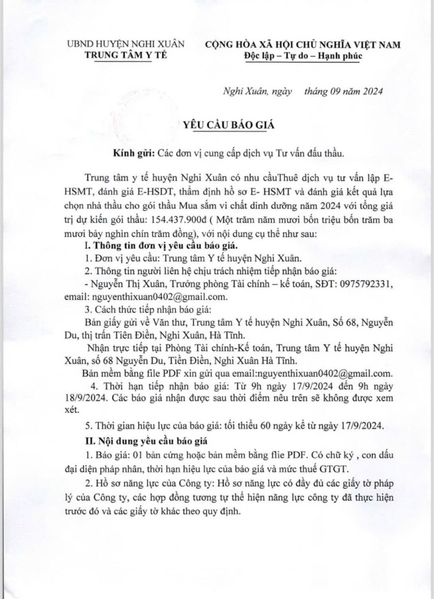 Trung tâm y tế huyện Nghi Xuân có nhu cầu thuê dịch vụ tư vấn lập E-HSMT, đánh giá E-HSDT, thẩm định hồ sơ E-HSMT và đánh giá kết quả lựa chọn nhà thầu cho gói thầu Mua sắm vi chất dinh dưỡng năm 2024.