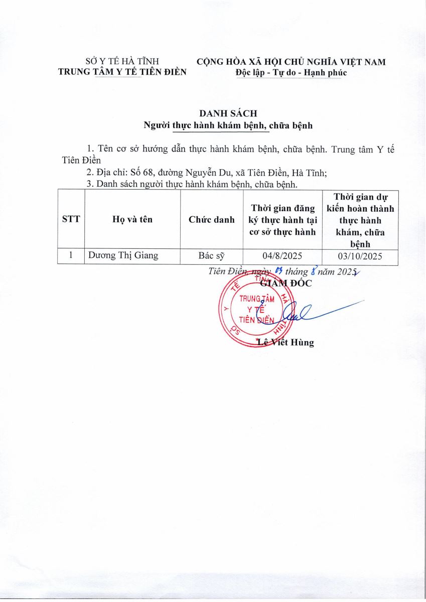 Người thực hành khám bệnh, chữa bệnh tại Trung tâm Y tế Tiên Điền