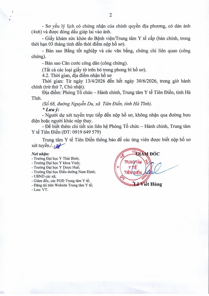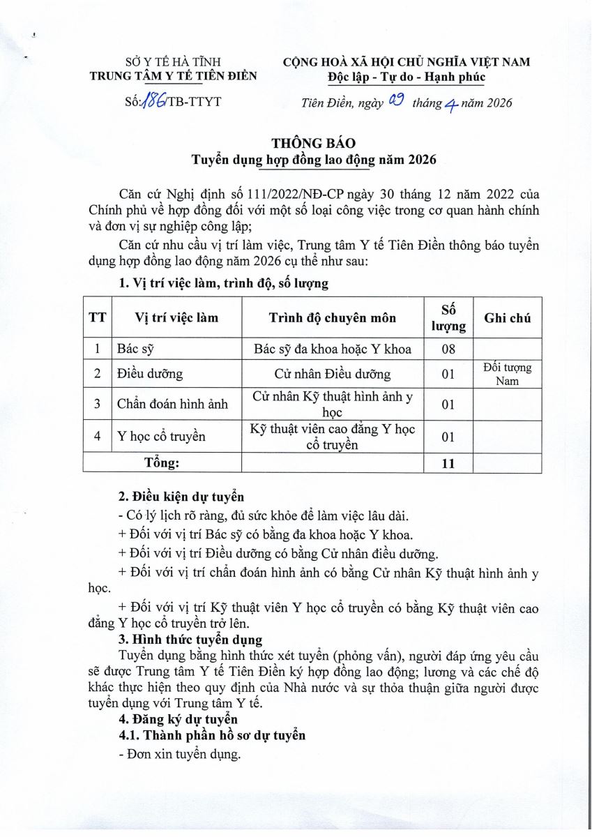 | Trung tâm Y tế Tiên Điền thông báo tuyển dụng lao động