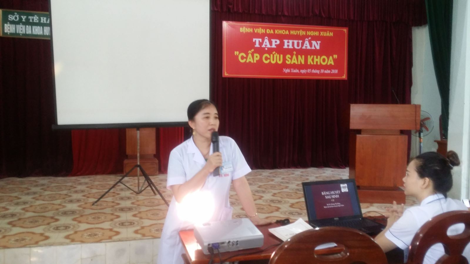 Ngày 5/10/2018, tại bệnh viện đa khoa huyện Nghi Xuân, Bệnh viện kết hợp với TTYT dự phòng của huyện đã tổ chức đợt tập huấn bồi dưỡng chuyên môn cho cán bộ ở các trạm y tế xã, đơn vị nhằm giúp mọi người nhận thức tốt tầm quan trọng của việc chẩn đoán và xử trí tốt các trường hợp nguy cấp như Tiền sản giật và chảy máu sau sinh do trưởng khoa Sản, BSCKI Hoàng Thị Hồng giảng bài.