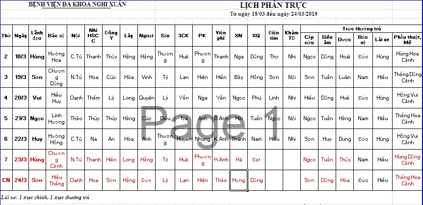 LỊCH TRỰC TỪ 18/3-24/3/2019