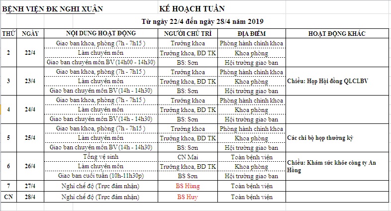 KẾ HOẠCH TUẦN TỪ 22/04 - 28/04/2019
