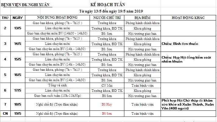 | KẾ HOẠCH HOẠT ĐỘNG TỪ 13/5 - 19/5/2019