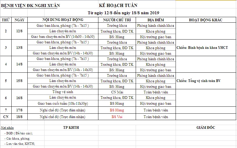 KẾ HOẠCH TUẦN TỪ 12/8 - 18/8/2019