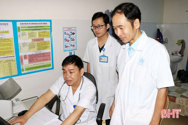 Bác sĩ Hoàng Hải Đức (bên phải) chia sẻ kinh nghiệm với các đồng nghiệp Bệnh viện Đa khoa huyện Nghi Xuân