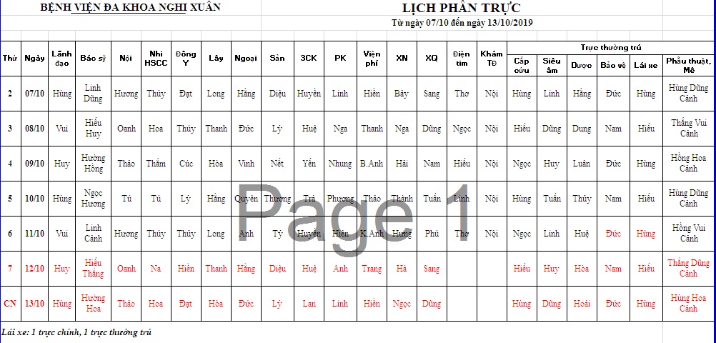LỊCH TRỰC TỪ 07/10 - 13/10/2019