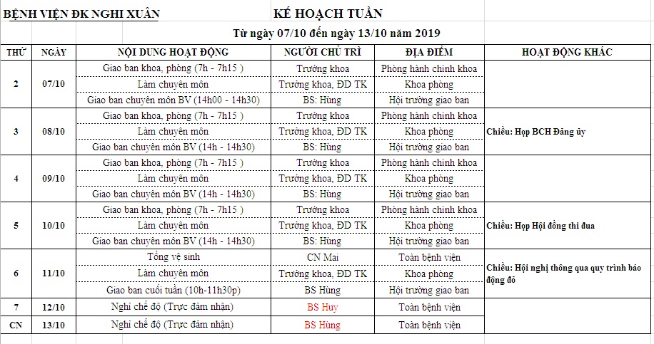 KẾ HOẠCH TUẦN TỪ 07/10 - 13/10/2019
