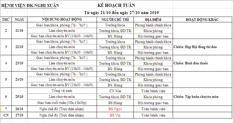 KẾ HOẠCH TUẦN TỪ 21/10 - 27/10/2019