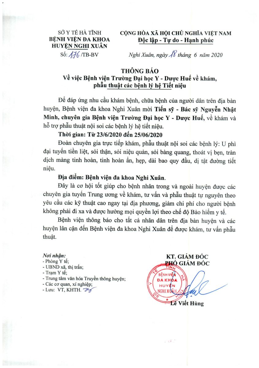 Vậy Bệnh viện đa khoa huyện Nghi Xuân thông báo để các đồng nghiệp và tất cả nhân dân trong, ngoài huyện biết và giới thiệu cho bệnh nhân đến Bệnh viện đa khoa huyện Nghi Xuân để được khám, tư vấn và điều trị.
