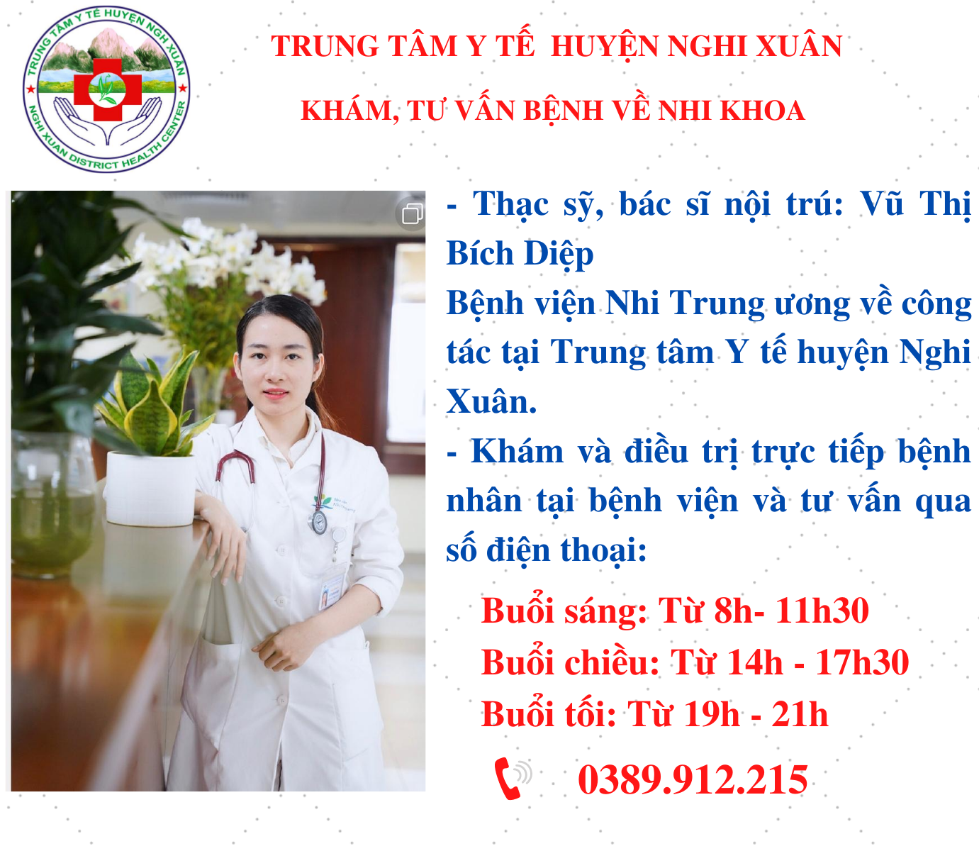 Công tác tai bệnh viện Nhi Trung ương về làm việc tại khoa Nhi, Trung tâm Y tế huyện Nghi Xuân theo Dự án "Đào tạo, chăm sóc sức khỏe ban đầu về Nhi khoa". Để đảm bảo thuận tiện cho người dân được sử dụng dịch vụ y tế tốt nhất, ngoài khám và điều trị trực tiếp bệnh nhân tại bệnh viện, BS Diệp còn khám và tư vấn cho bệnh nhân qua số điện thoại như sau: