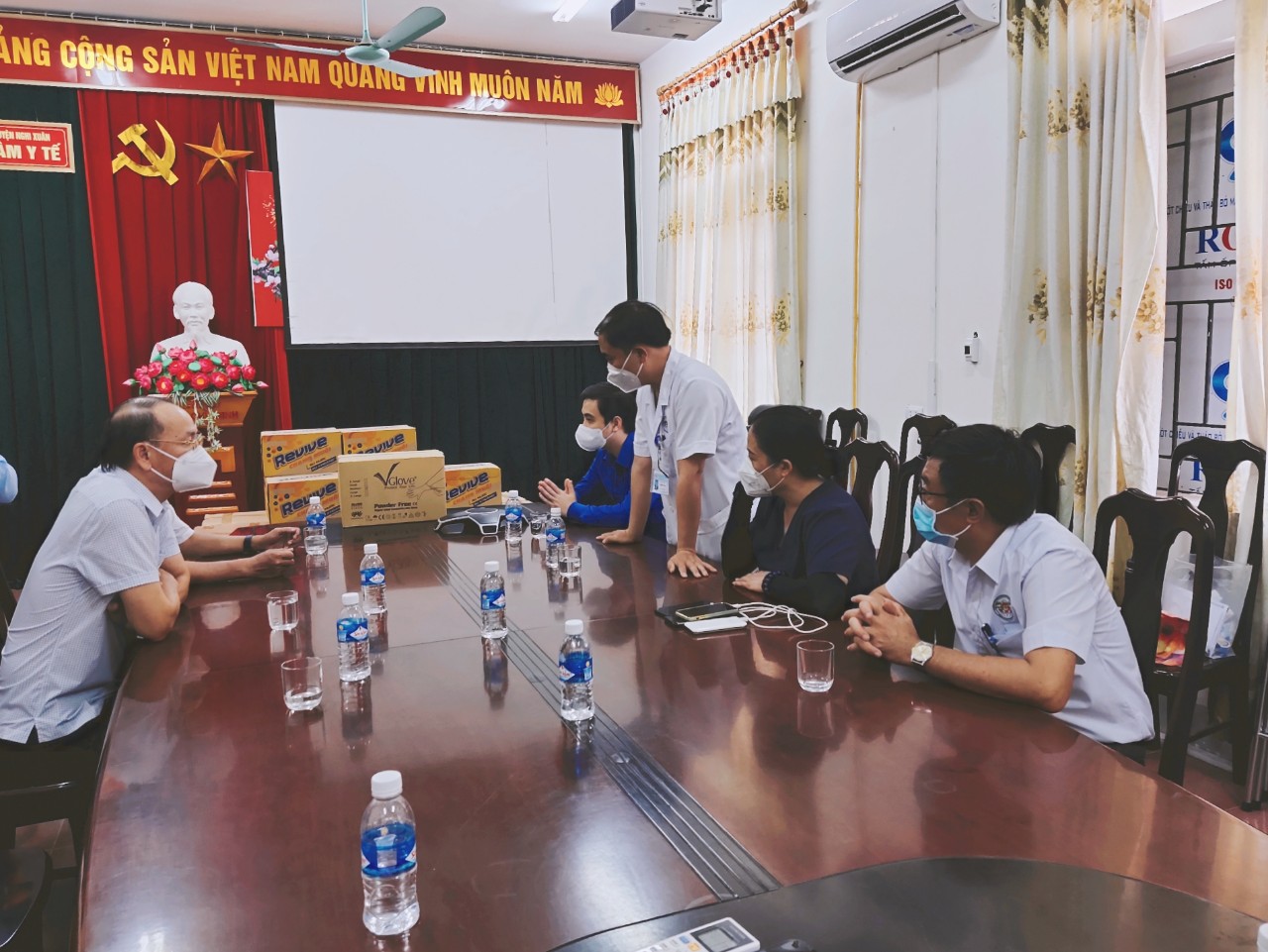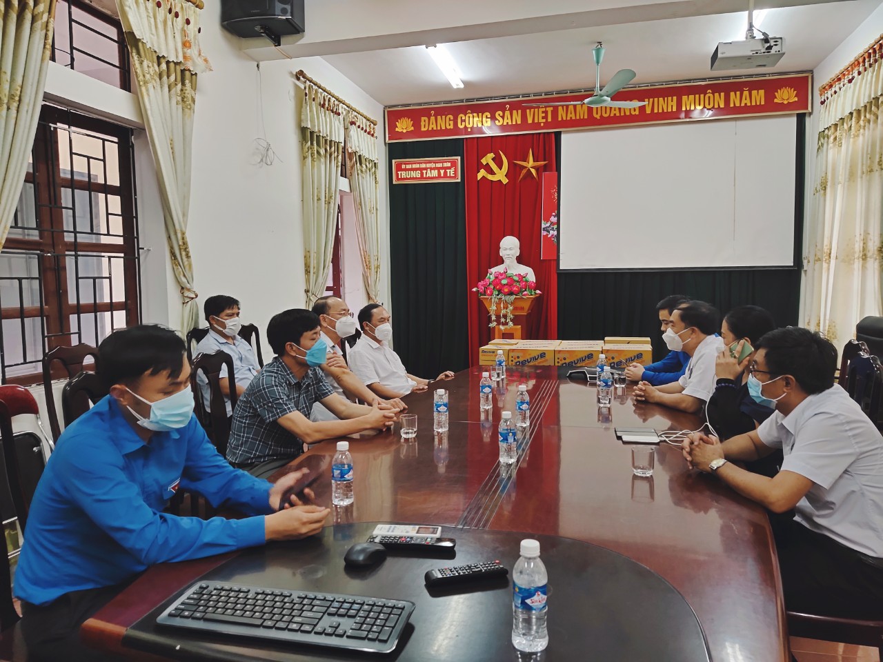 Sáng ngày 23/8/2021, đồng chí Võ Hồng Hải, Uỷ viên Ban thường vụ, Trưởng ban tổ chức tỉnh ủy, đồng chí Lê Thành Đông Uỷ viên BCH Đảng bộ tỉnh Bí thư tỉnh đoàn cùng các đồng chí Phan Tấn Linh, Bí thư huyện ủy Nghi Xuân, đồng chí Lê Tiến Hải, Chủ tịch UBMTTQ huyện đã đến kiểm tra công tác phòng chống dịch Covid - 19 và tặng quà cho Trung tâm Y tế huyện. Số quà tặng bao gồm: 1000 test nhanh phát hiện kháng nguyên SARS - CoV2, 1000 đôi găng tay y tế, 10. 000 khẩu trang kháng khuẩn và 10 thùng nước khoáng.