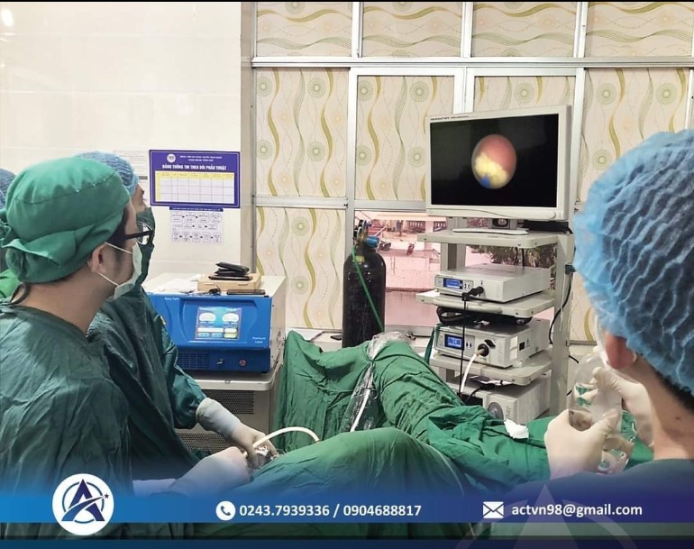 Các Bác sỹ Khoa Ngoại và Chuyên gia đang thực hiện tán sỏi ngược dòng