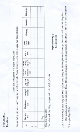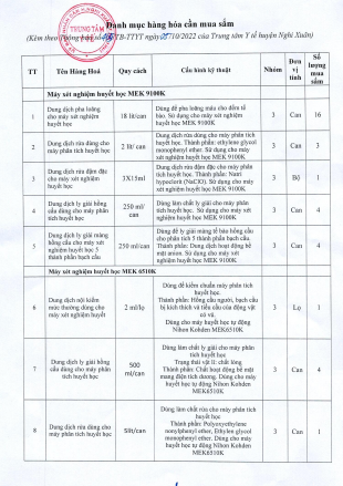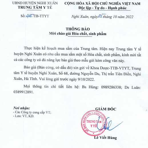| TRUNG TÂM Y TẾ HUYỆN NGHI XUÂN MỜI CHÀO GIÁ HÓA CHẤT, SINH PHẨM