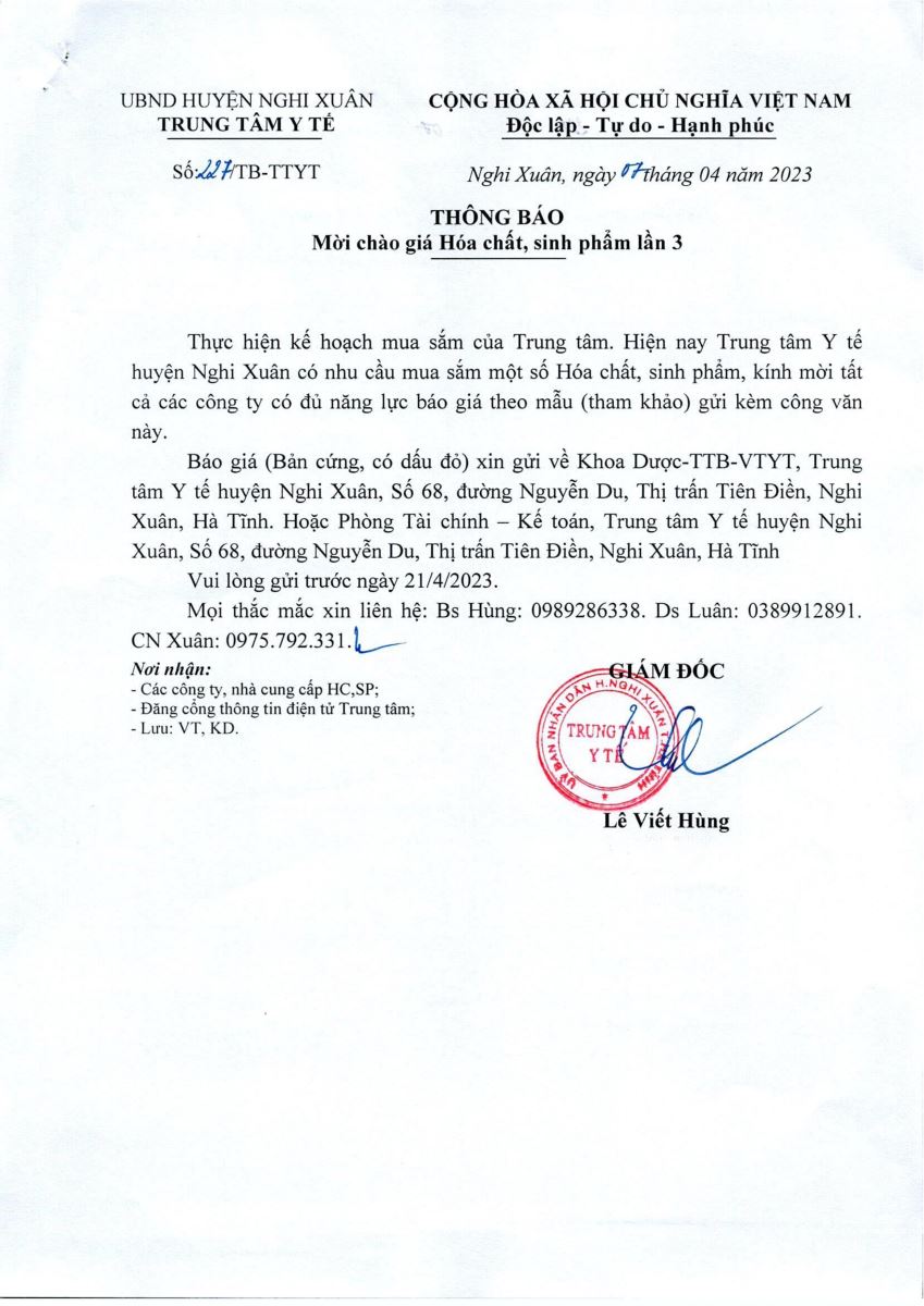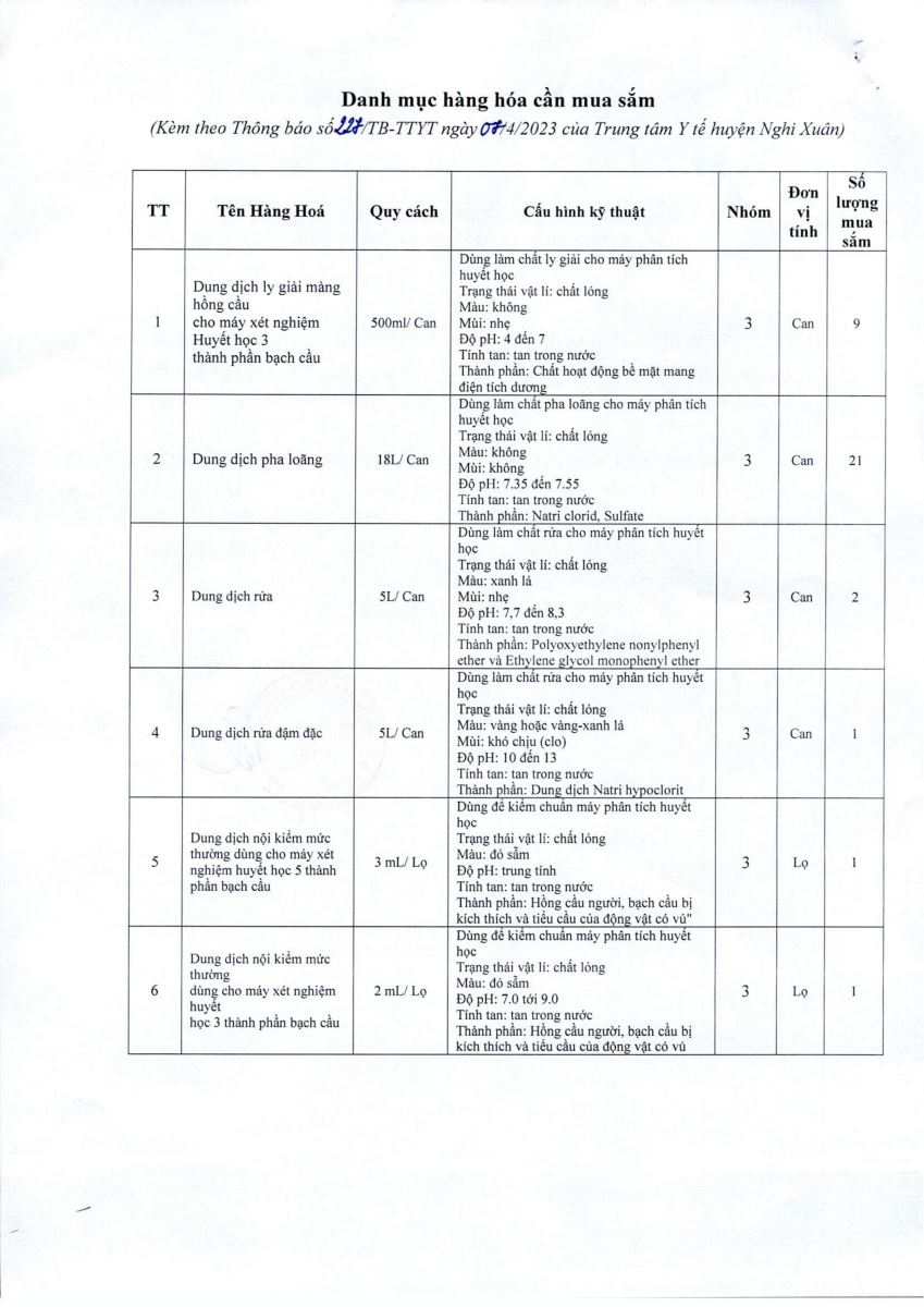 | Thông báo mời chào hàng hóa chất, sinh phẩm