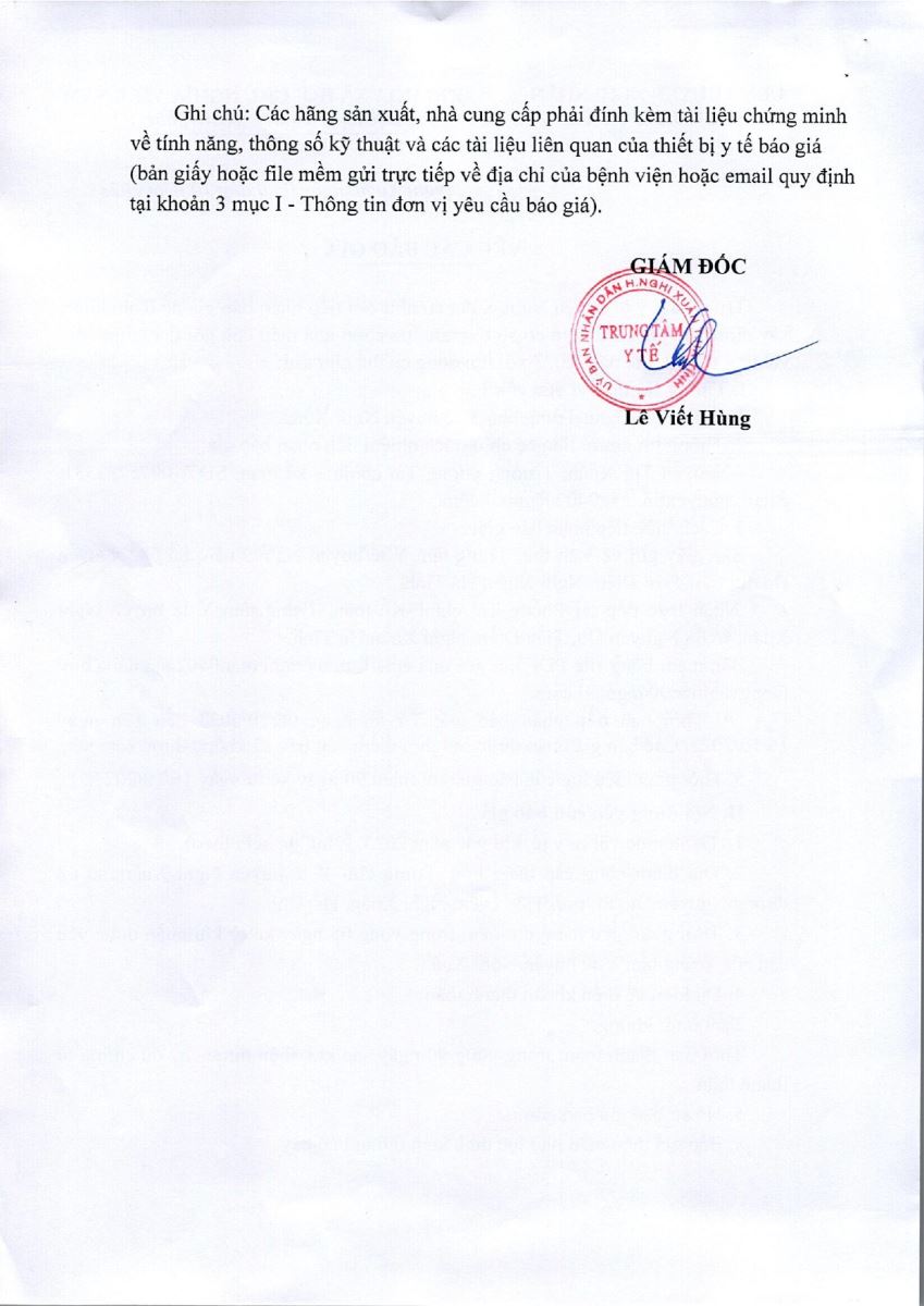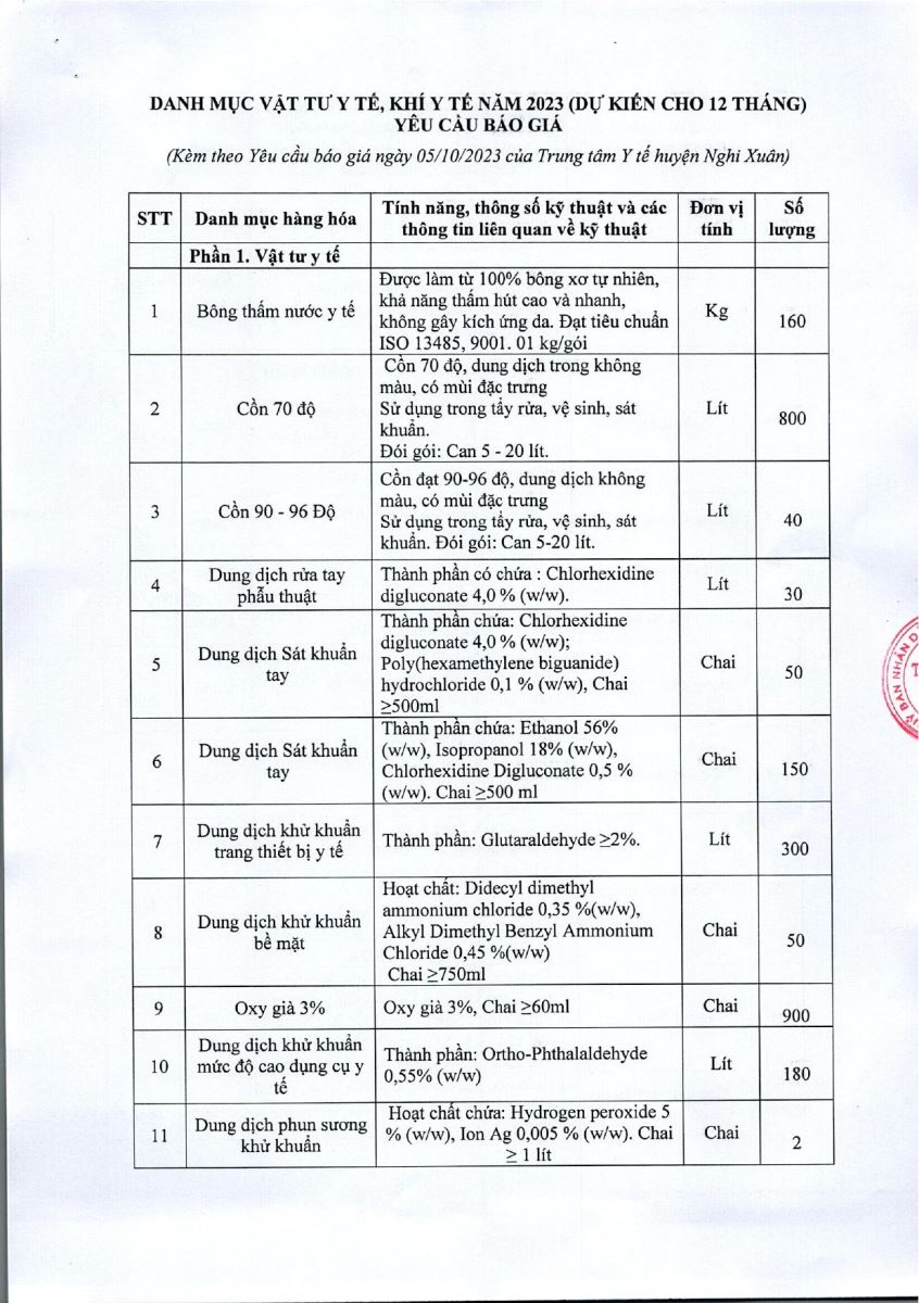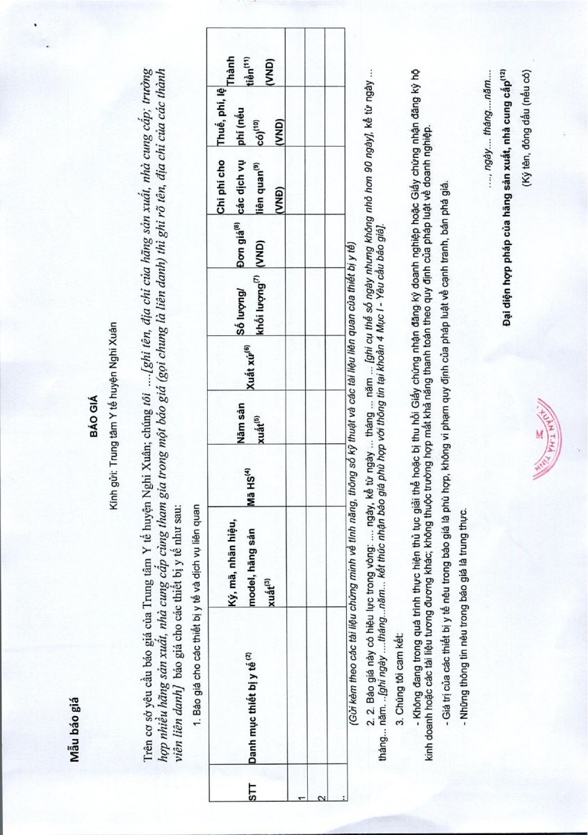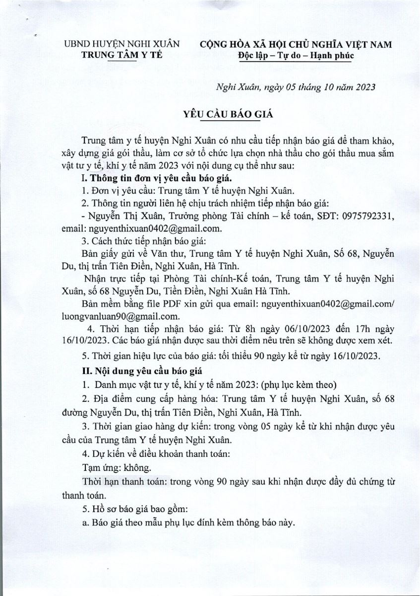 Trung tâm y tế huyện Nghi Xuân có nhu cầu tiếp nhận báo giá để tham khảo, xây dựng giá gói thầu, làm cơ sở tổ chức lựa chọn nhà thầu cho gói thầu mua sắm vật tư y tế, khí y tế năm 2023, cụ thể như sau: