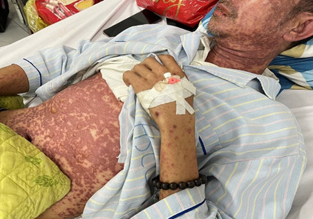Sau dùng thuốc được 3 ngày thì bệnh nhân xuất hiện tổn thương da là các dát đỏ thẫm, tổn thương bọng nước nhăn nheo, trợt da, hoại tử da rải rác tay chân, thân mình, sau đó nhanh chóng lan toàn thân. Tiền sử bệnh nhân khỏe mạnh, chưa phát hiện tiền sử di ứng thuốc. Bệnh nhân đến khám tại Trung tâm Y tế huyện Nghi Xuân Hà Tĩnh được Chẩn đoán Dị ứng thuốc nặng (thể TEN) được chỉ định nhập viện xử trí ban đầu và chuyển tuyến trên điều trị tiếp.