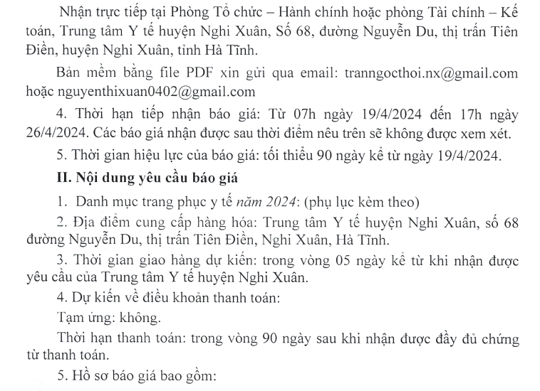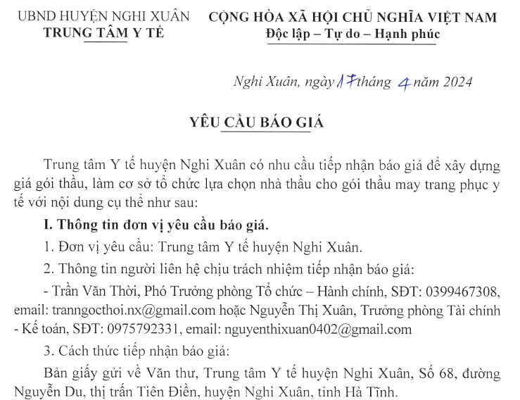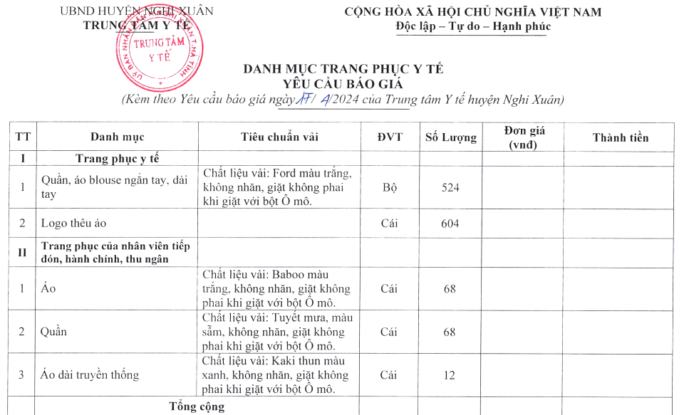 Trung tâm Y tế huyện Nghi Xuân có nhu cầu tiếp nhận báo giá để xây dựng giá gói thầu về may trang phục y tế.