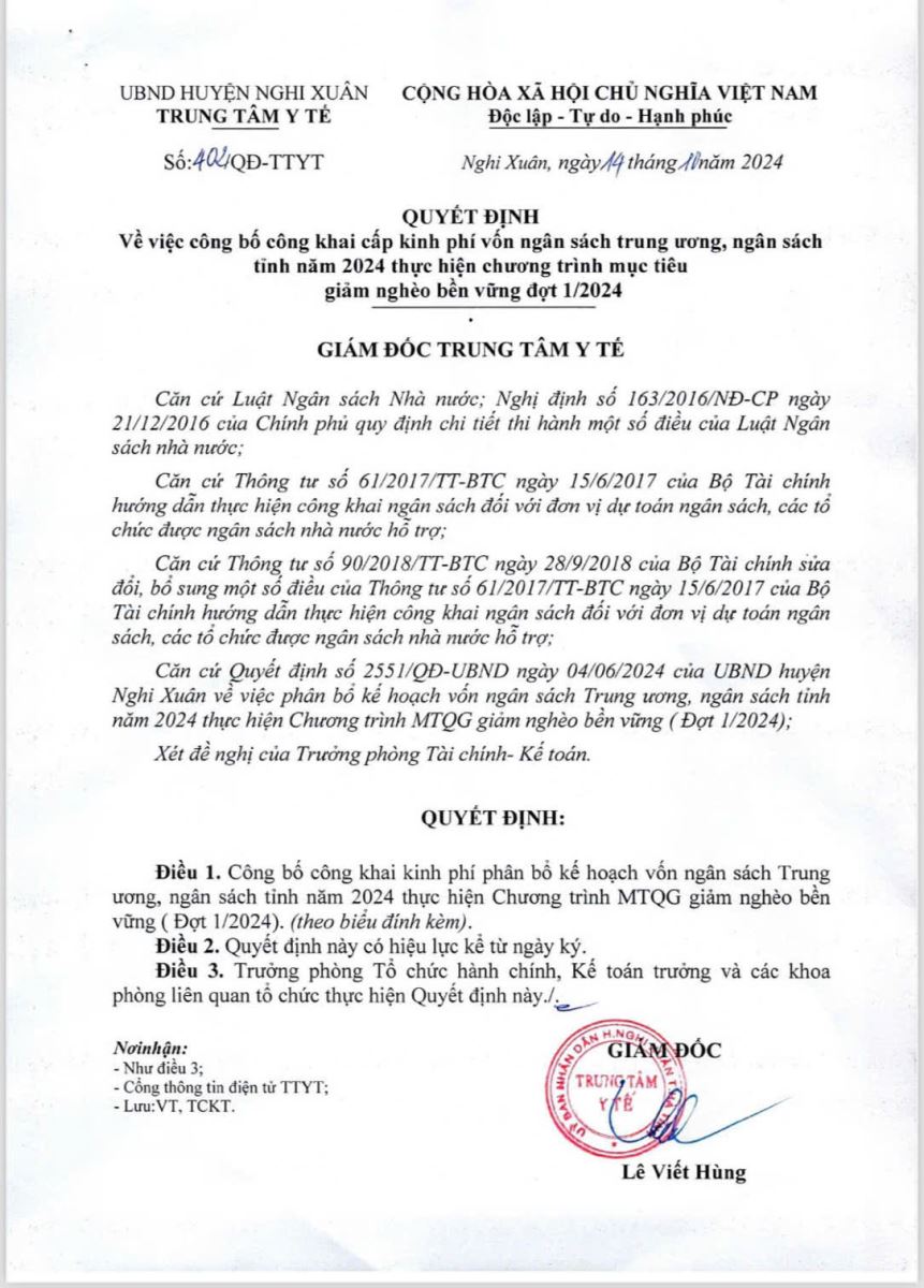 Về việc công bố công khai cấp kinh phí vốn ngân sách trung ương, ngân sách tỉnh năm 2024 thực hiện chương trình mục tiêu giảm nghèo bền vững đợt 1/2024