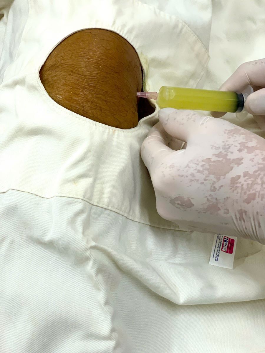 Sau 15 phút thực hiện thủ thuật dưới, bác sĩ đã lấy ra 3 xi-lanh dịch khớp màu vàng với tổng dung tích 30 ml. Bệnh nhân vui mừng chia sẻ: "Lúc mới đến khớp gối tôi đau lắm, căng cứng, không đi lại được. Giờ hút dịch xong thấy gối nhẹ nhõm hẳn, đỡ đau nhiều mà có thể co duỗi bình thường, đi lại nhẹ nhàng được luôn rồi"