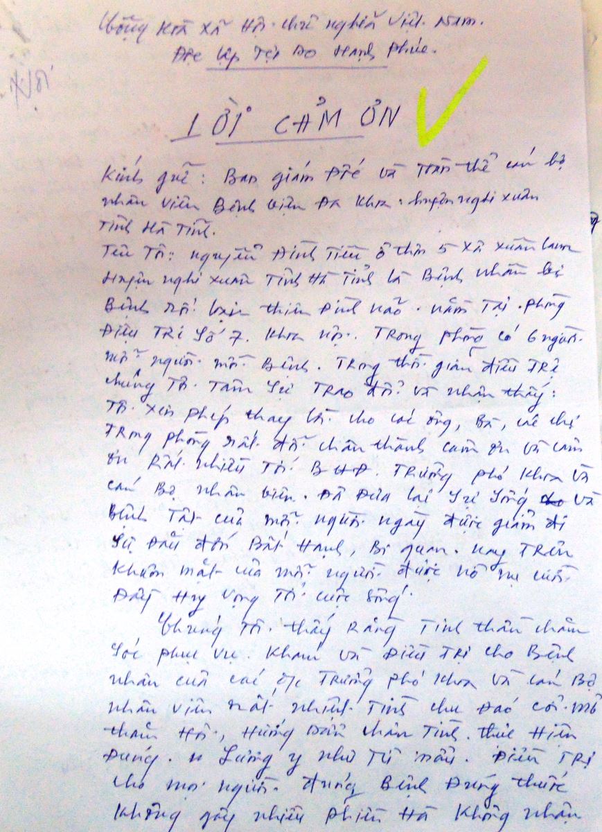 Tên tôi: Nguyễn Đình Tiêu, thôn 5 xã Xuân Lam, huyện Nghi Xuân là bệnh nhân bị rối loạn tiền đình, nằm điều trị phòng điều trị số 7 khoa Nội, trong phòng gồm 06 người, mỗi người mỗi bệnh, trong quá trình điều trị chúng tôi trao đổi tâm sự và nhận thấy, tôi thay lời các bệnh nhân điều trị trong phòng rất chân thành cảm ơn và cảm ơn rất nhiều tới Ban giám đốc, Trưởng, Phó khoa và toàn thể cán bộ nhân viên đã đẩy lùi bệnh tật, đau đớn và những bất hạnh, bi quan, đem lại sự sống, trên khuôn mặt của mỗi người bệnh nhân được nở nụ cười đầy hy vọng trong cuộc sống.