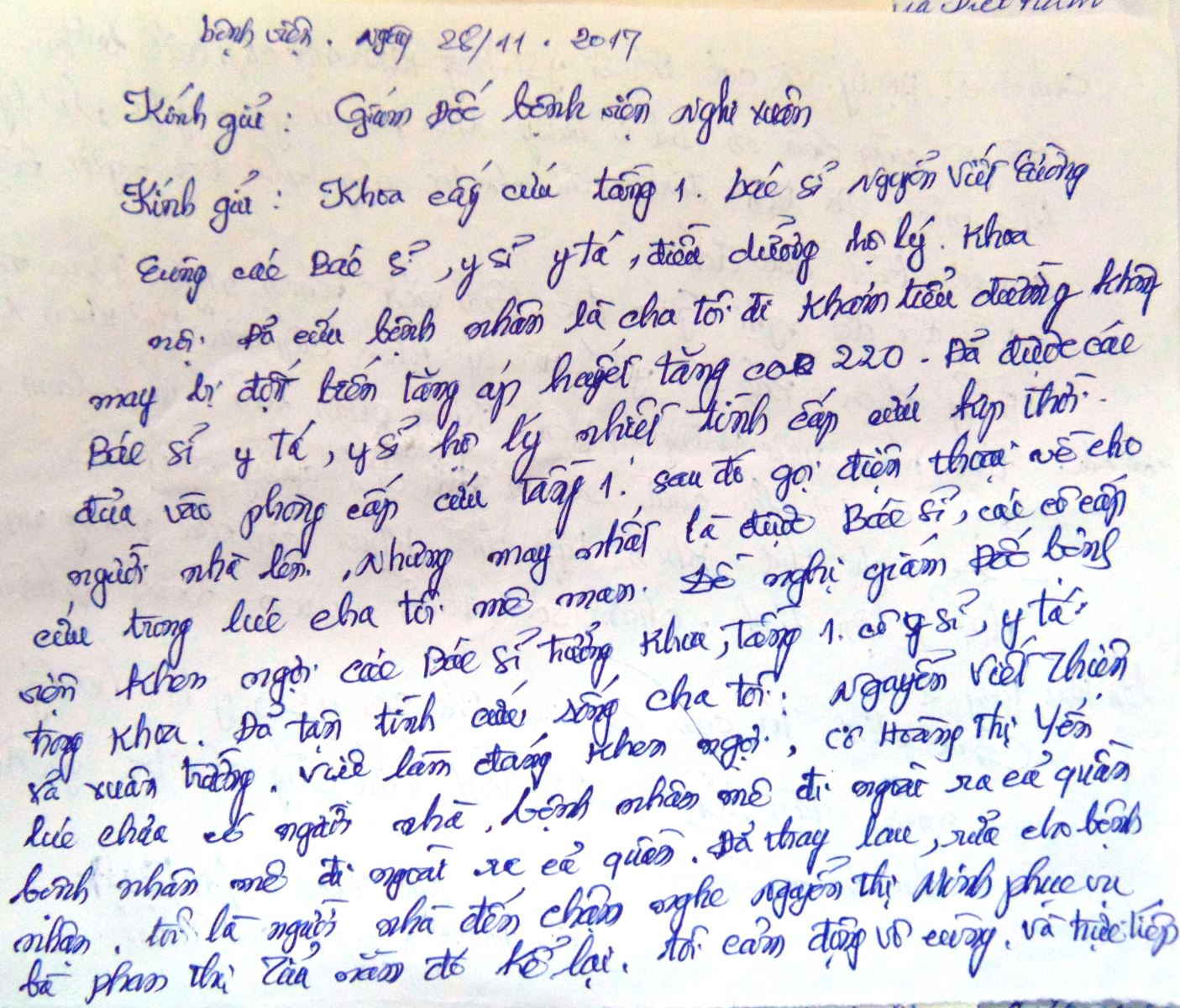 Một lần nữa tôi đề nghị Ban giám đốc khen ngợi kíp cấp cứu đã cứu sống cha tôi, gia đình cảm ơn tập thể khoa Hồi sức cấp cứu.