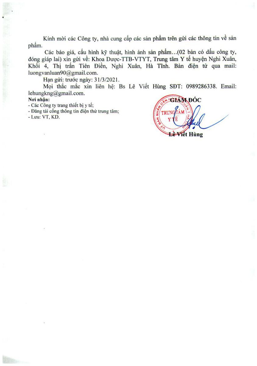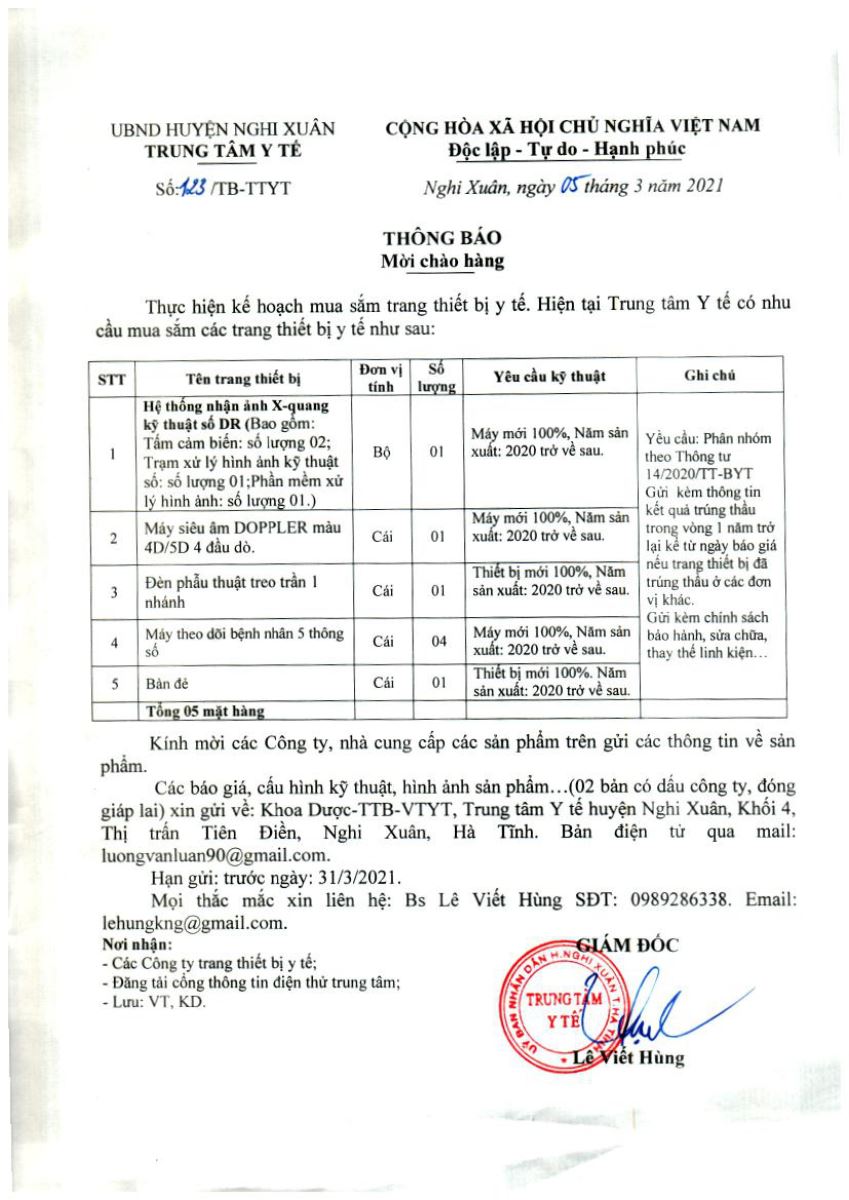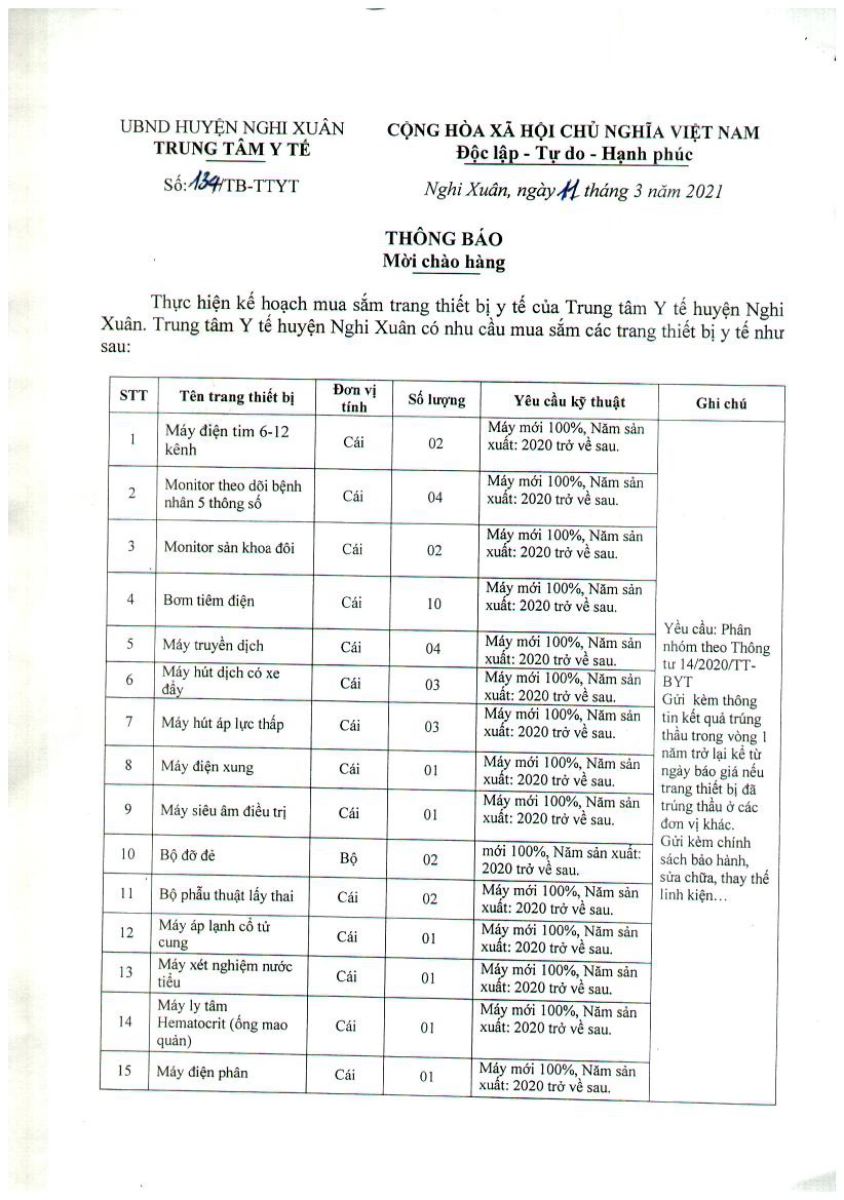 Thực hiện kế hoạch mua sắm trang thiết bị Y tế của Trung tâm Y tế huyện Nghi Xuân. Trung tâm Y tế huyện Nghi Xuân có nhu cầu mua sắm những mặt hàng sau: